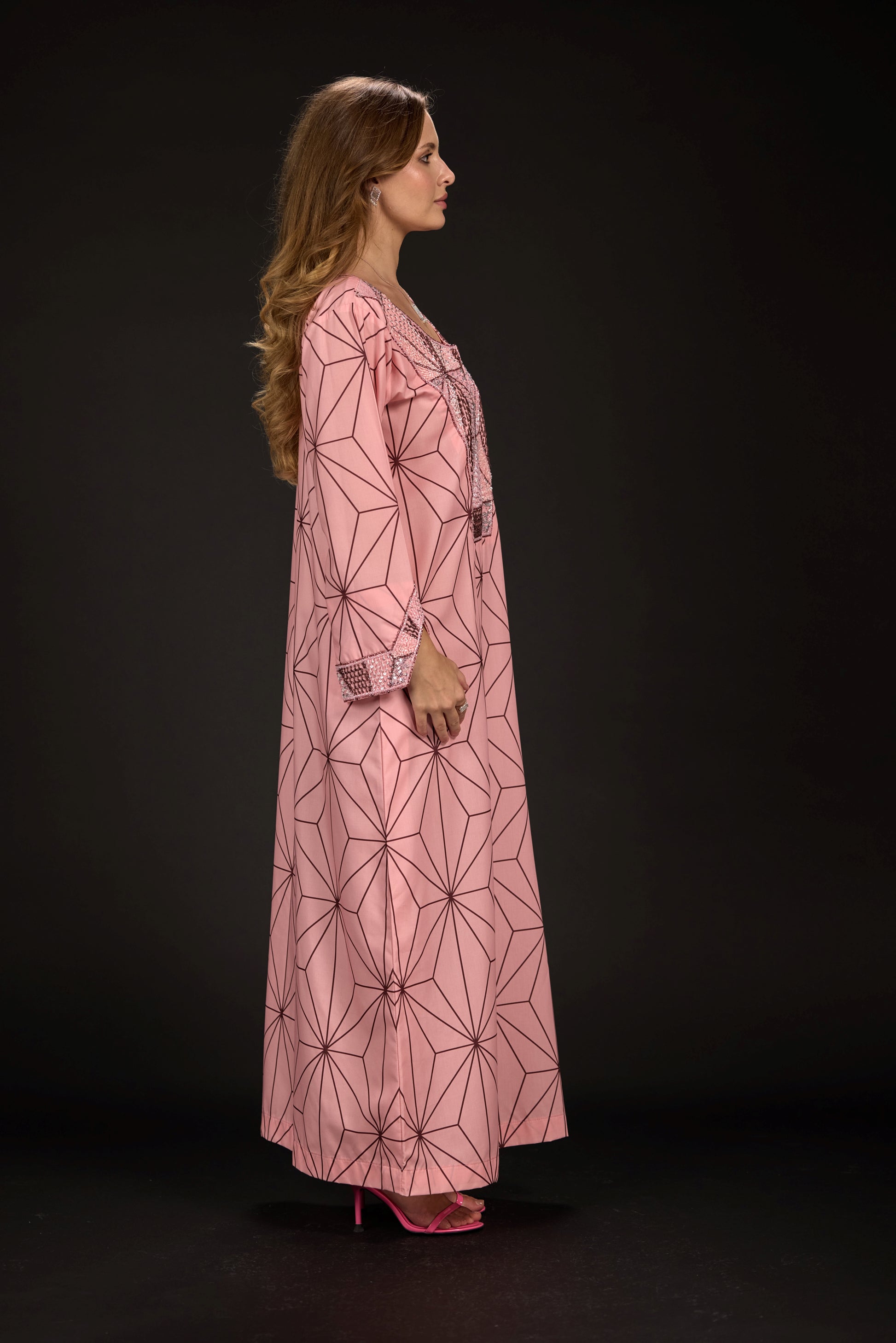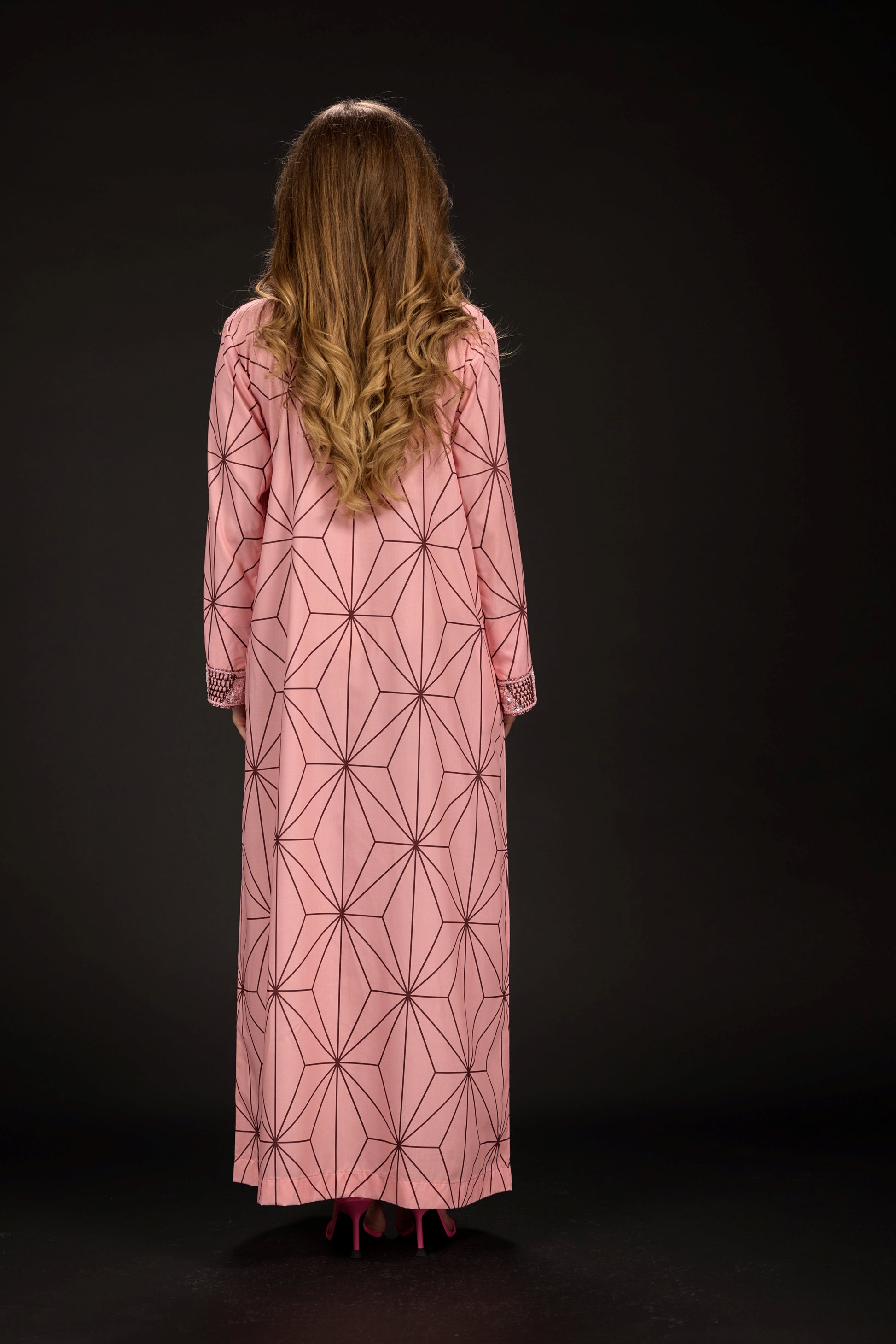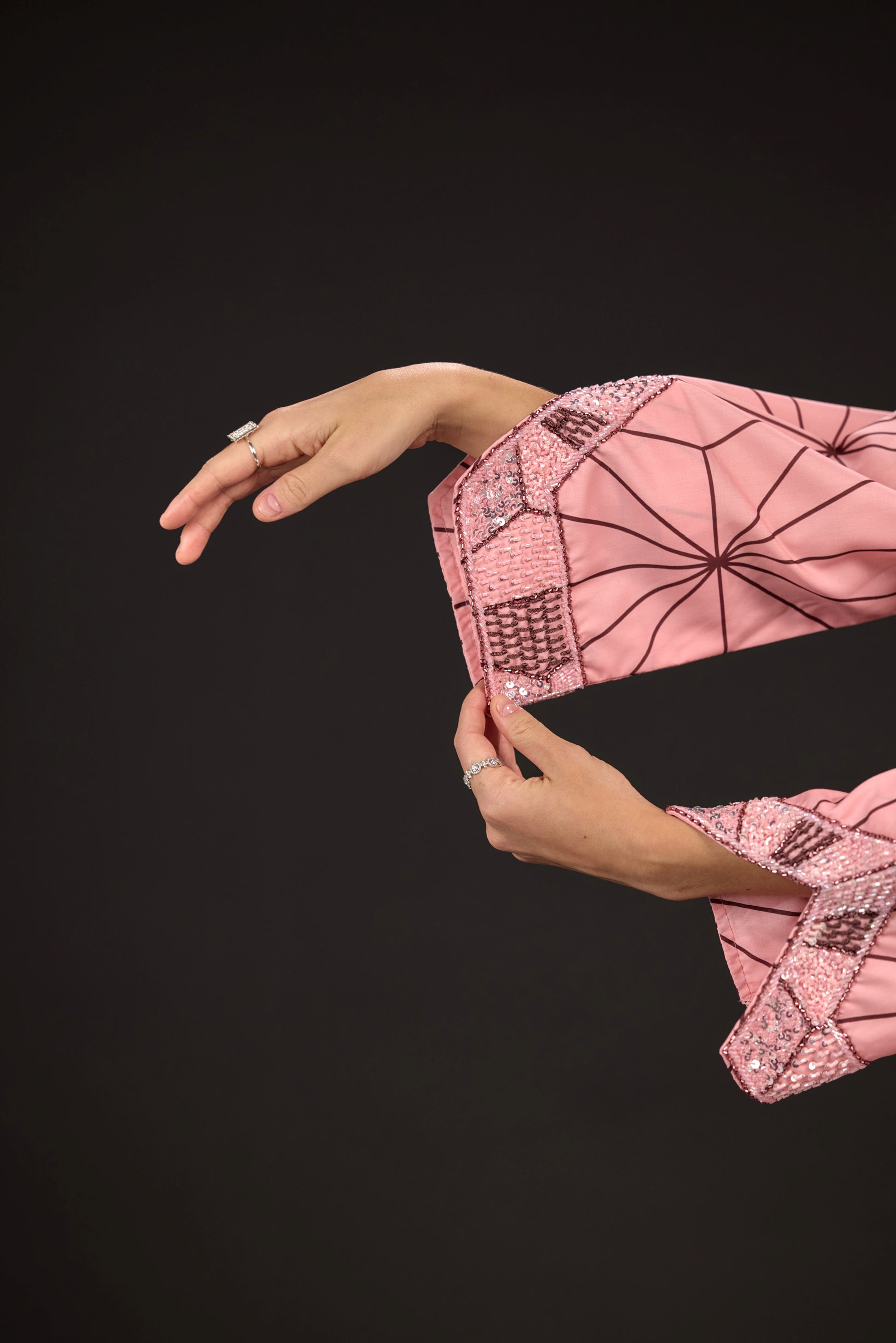 A custom-designed embroidered fabric piece that pays homage to traditional Emirati attire while drawing inspiration from the intricate patterns of Nezuko’s kimono and her signature checkered obi belt.