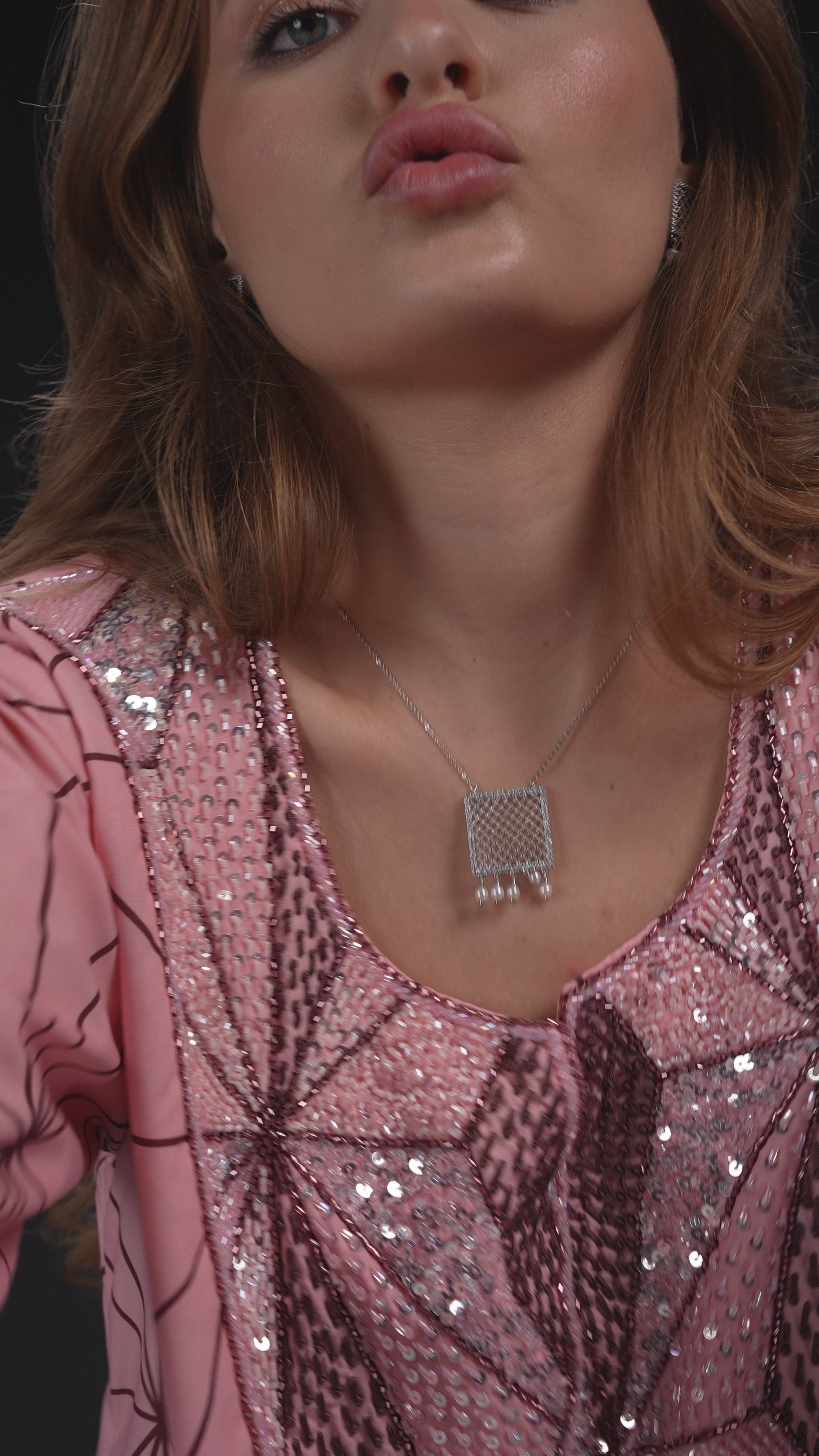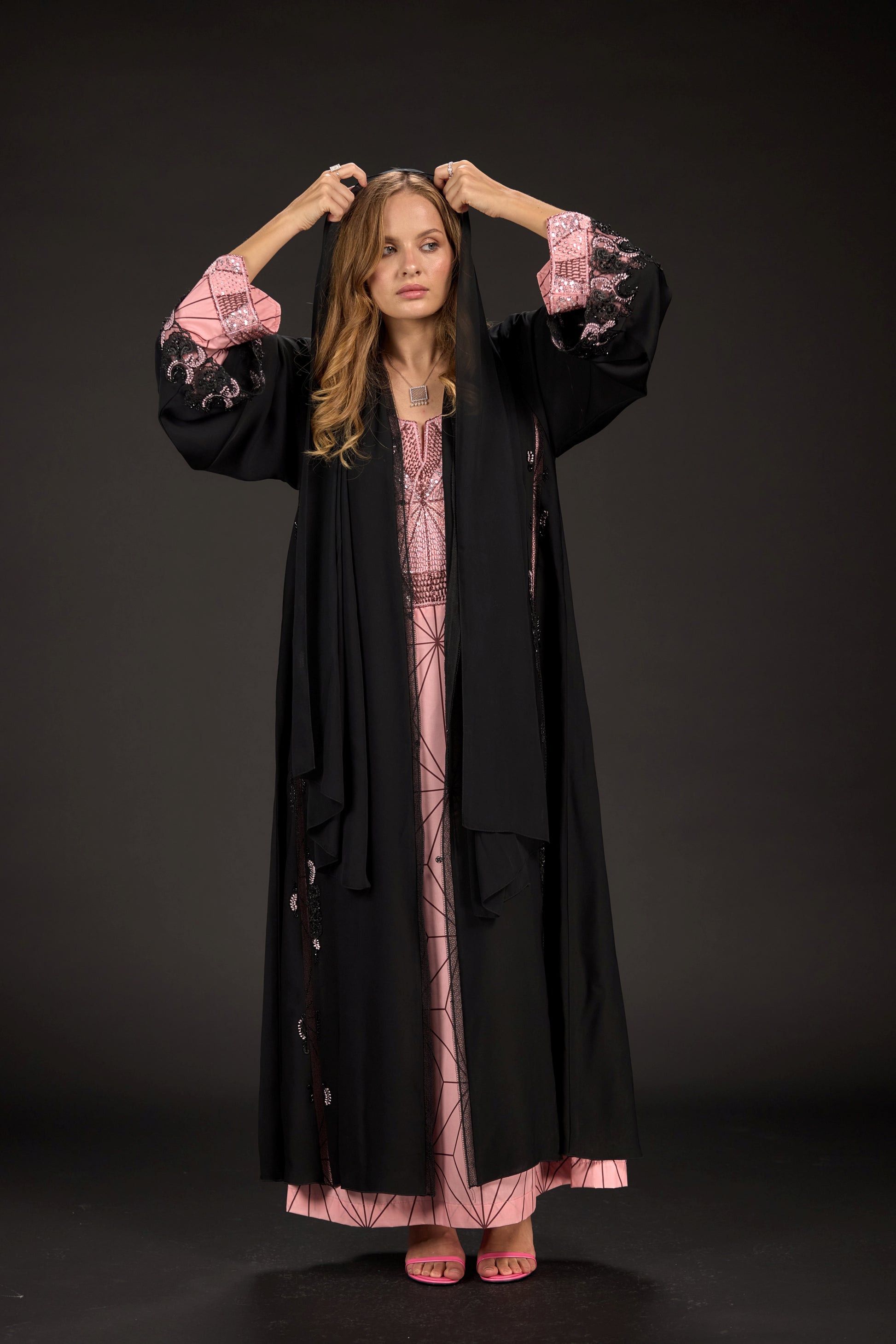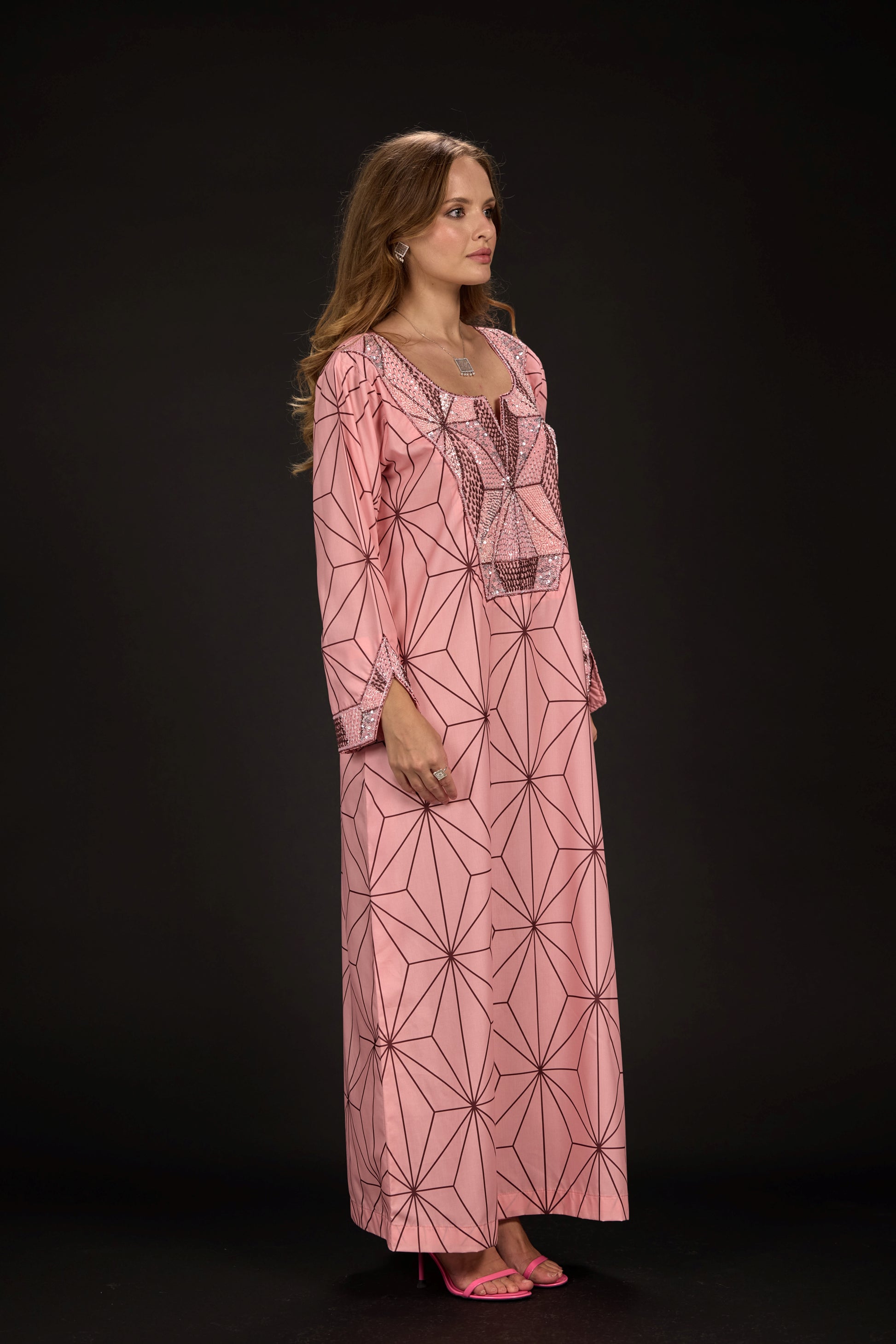 A custom-designed embroidered fabric piece that pays homage to traditional Emirati attire while drawing inspiration from the intricate patterns of Nezuko’s kimono and her signature checkered obi belt.