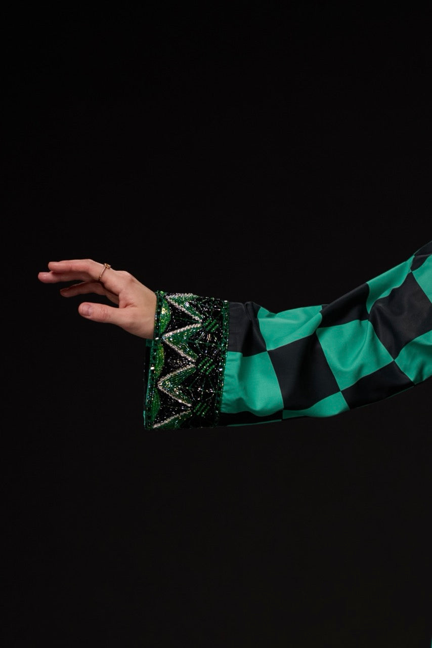 Honor the legacy of Tanjiro with this exceptional Tanjiro Mukhawara, crafted with intricate detail and inspired by his iconic Sun Earring and the bold black and green checkered Haori he wears which is the Japanese Ichimatsu pattern signifying prosperity and success.