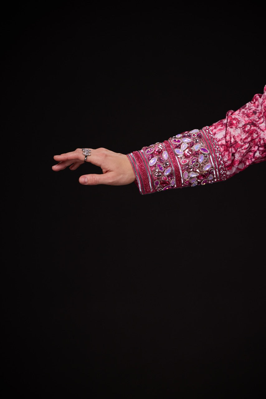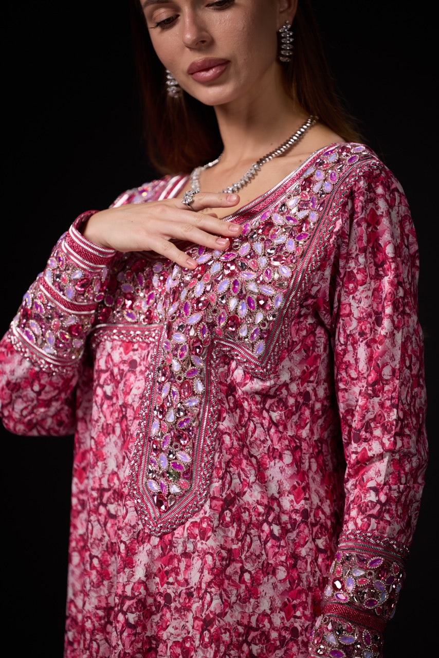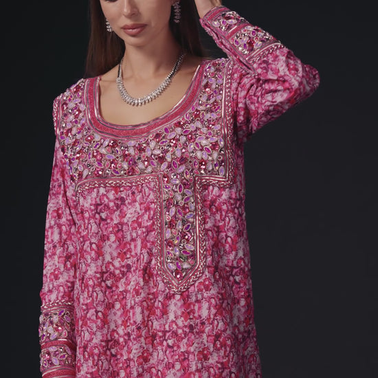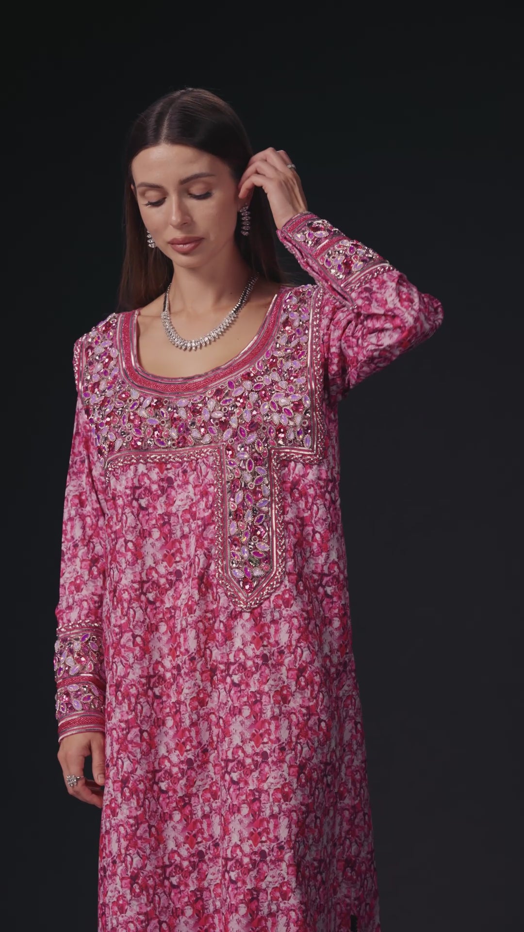 Crafted for elegance and comfort, this piece is best suited for cotton; silk is not available for this piece as its heavy with gemstones and silk is delicate fabric. The model is wearing cotton in S-M size with standard neck size and sleeve size M.