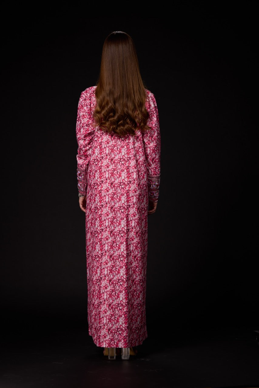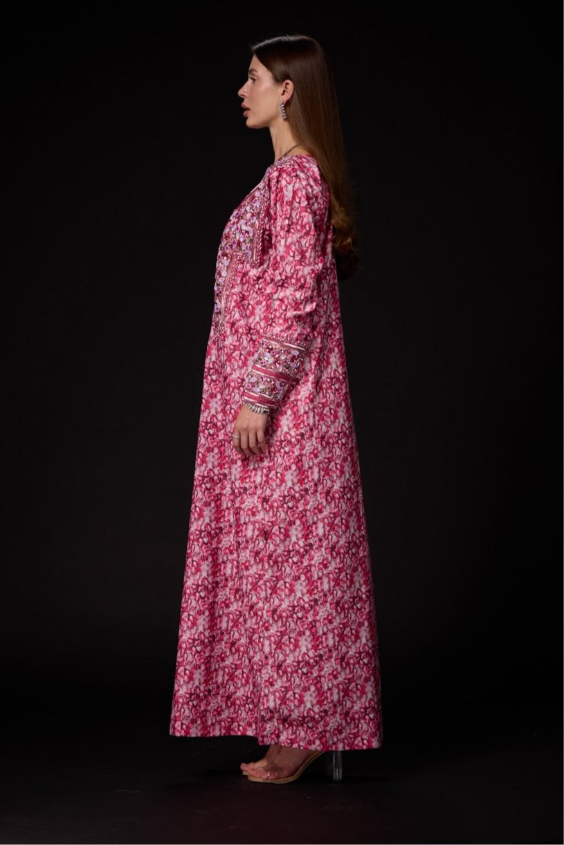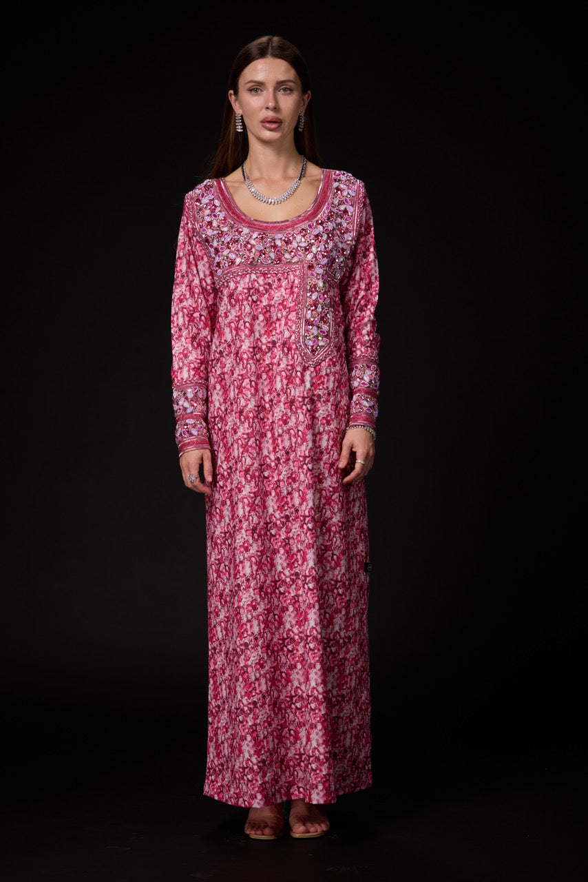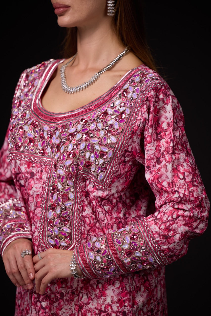 Crafted for elegance and comfort, this piece is best suited for cotton; silk is not available for this piece as its heavy with gemstones and silk is delicate fabric. The model is wearing cotton in S-M size with standard neck size and sleeve size M.