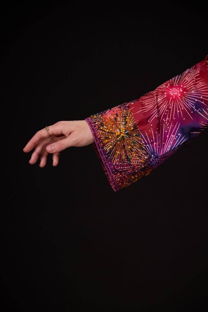 A vibrant piece capturing the spark of blades, bursts of flame, and fireworks in the night sky of their memorable fight. Embellished in crimson, gold, and violet, this Mukhawara reflects Tengen’s bold spirit and radiant strength during the fight — powerful, dazzling, and full of life.
