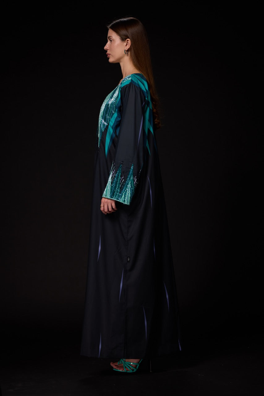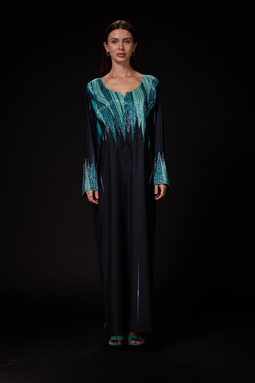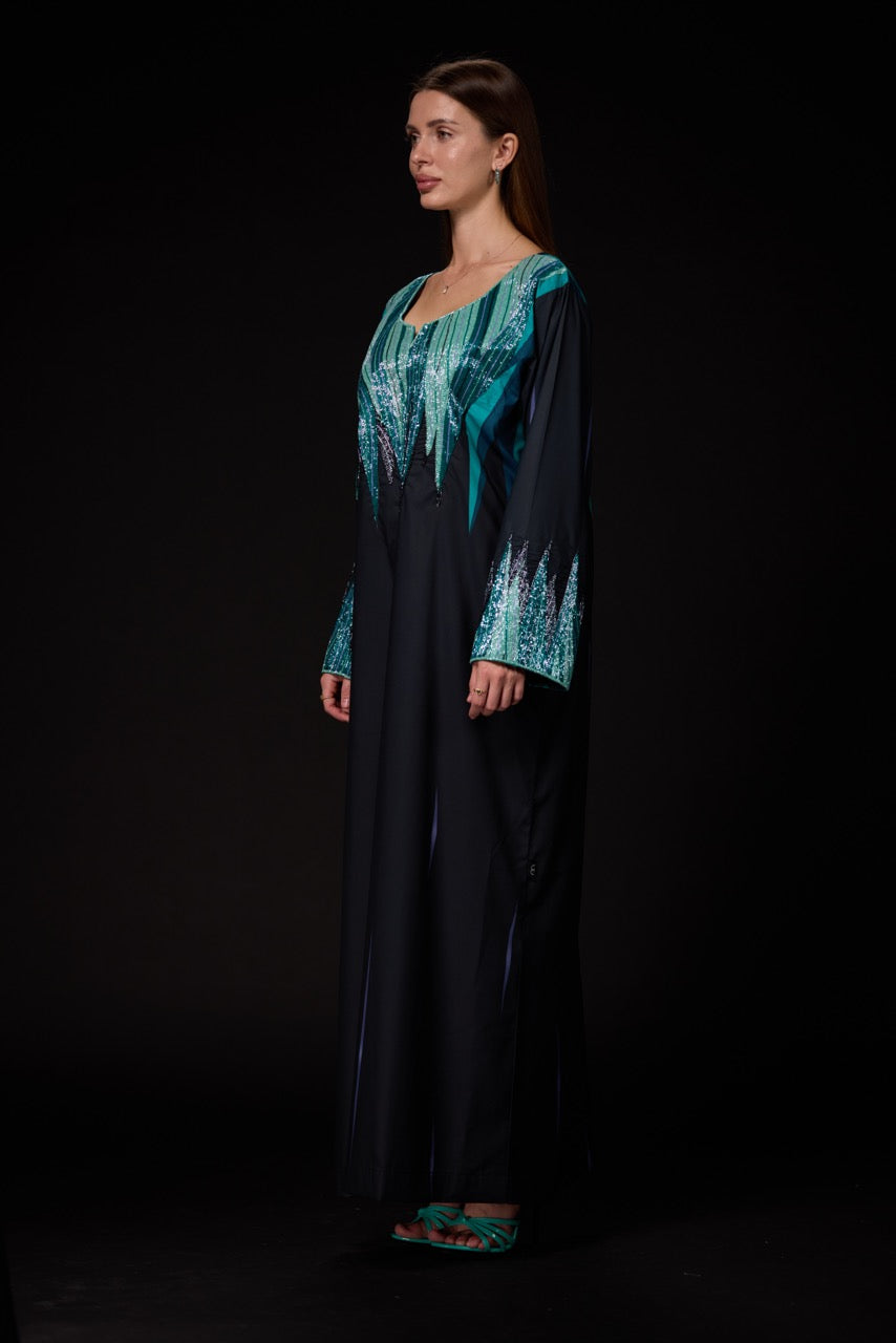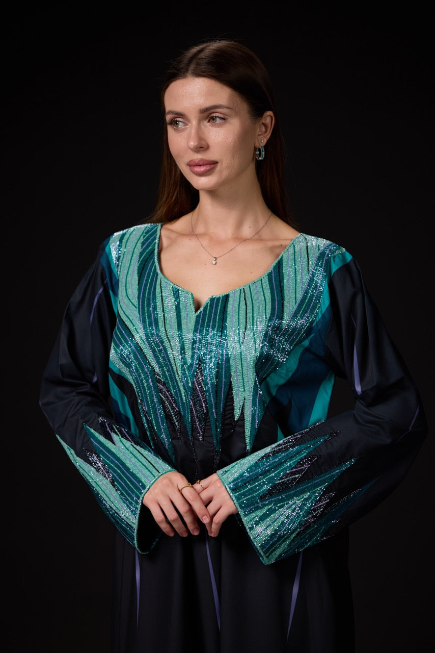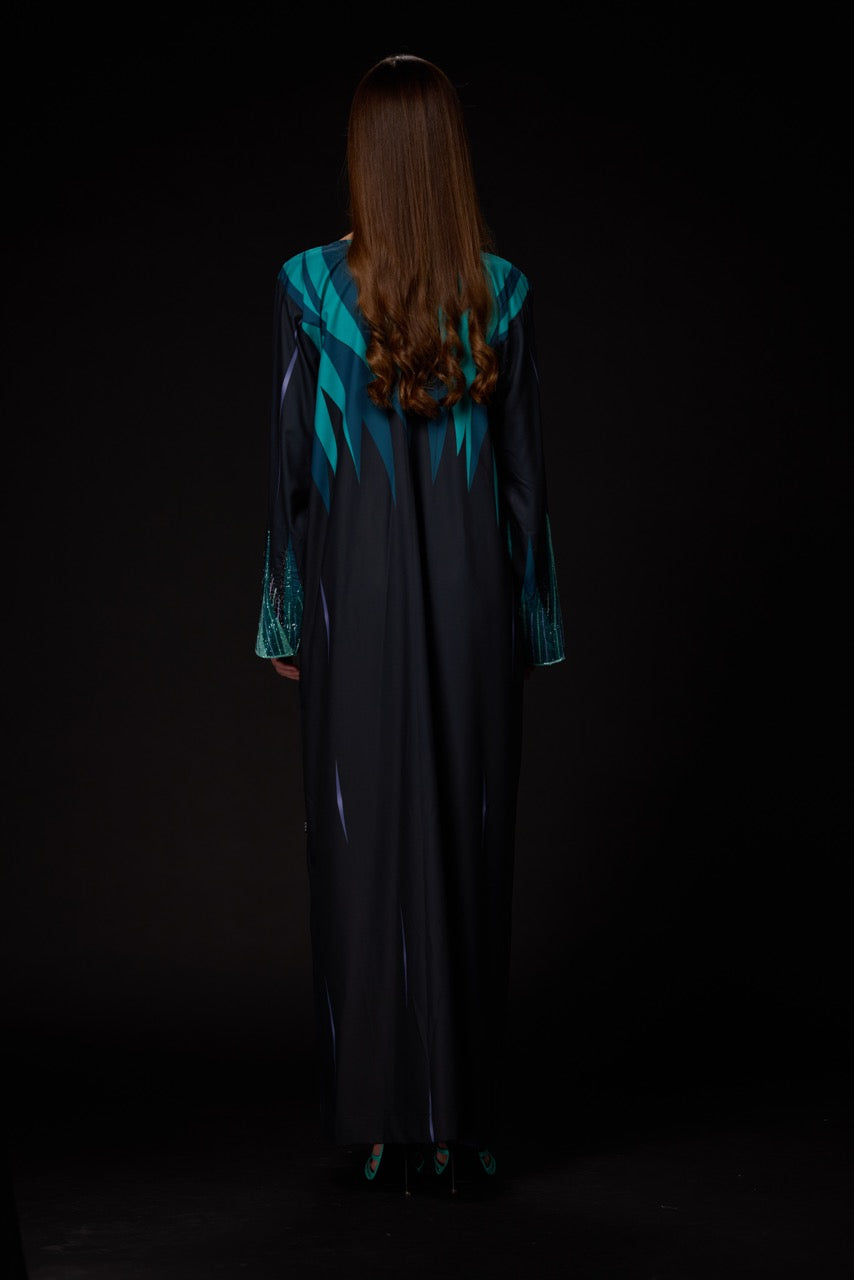 A masterpiece of calm elegance, the design mirrors the soft gradient of his silver-blue hair and the fluid light of his sword, reflected through intricate emerald, turquoise, teal, and silver embroidery. Set against a deep base, this piece radiates quiet strength and refined grace .