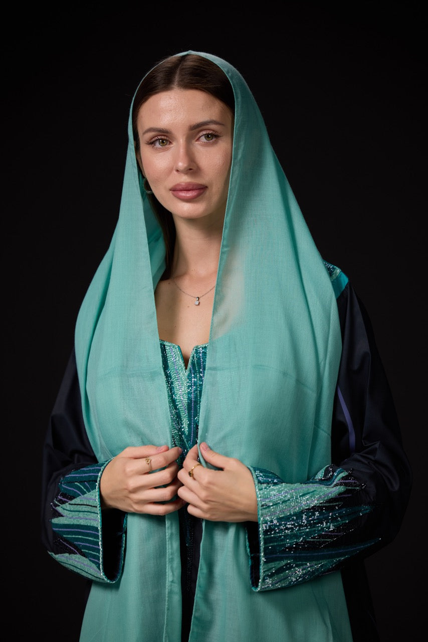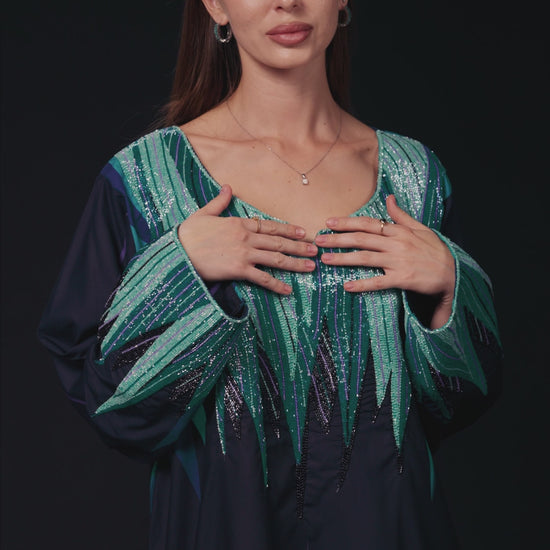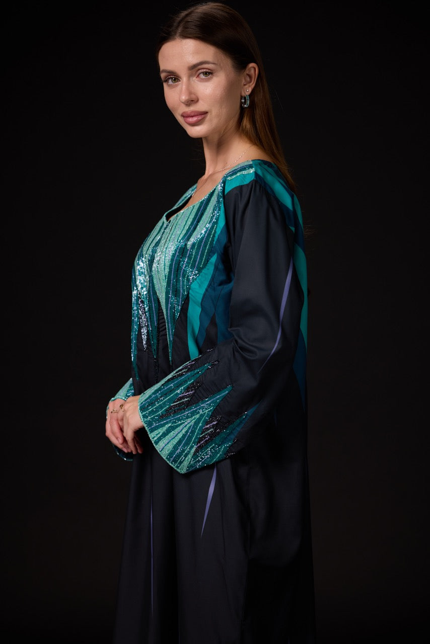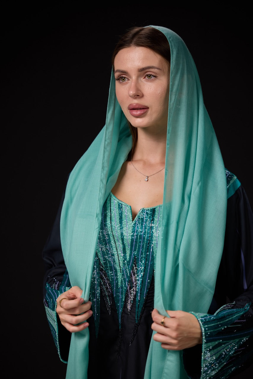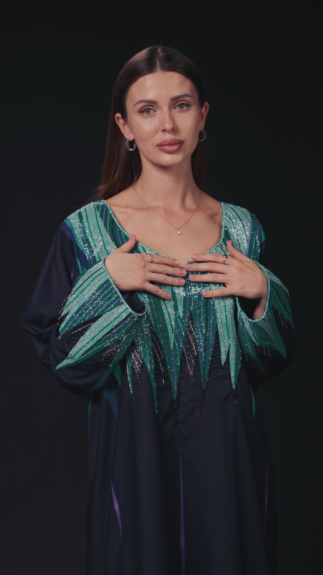 A masterpiece of calm elegance, the design mirrors the soft gradient of his silver-blue hair and the fluid light of his sword, reflected through intricate emerald, turquoise, teal, and silver embroidery. Set against a deep base, this piece radiates quiet strength and refined grace .