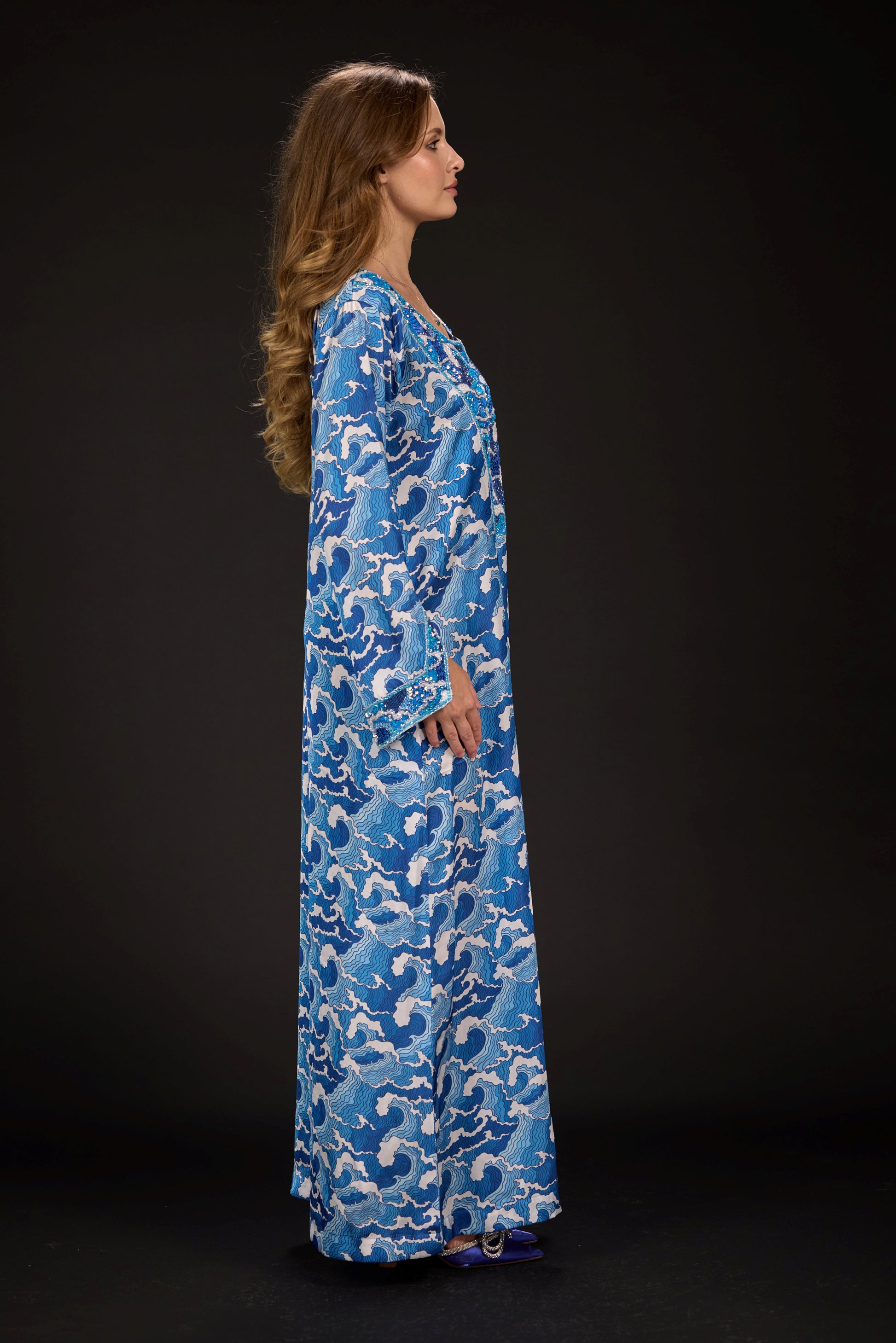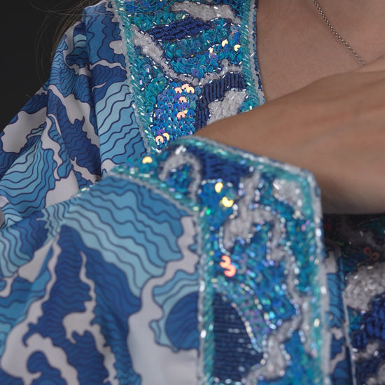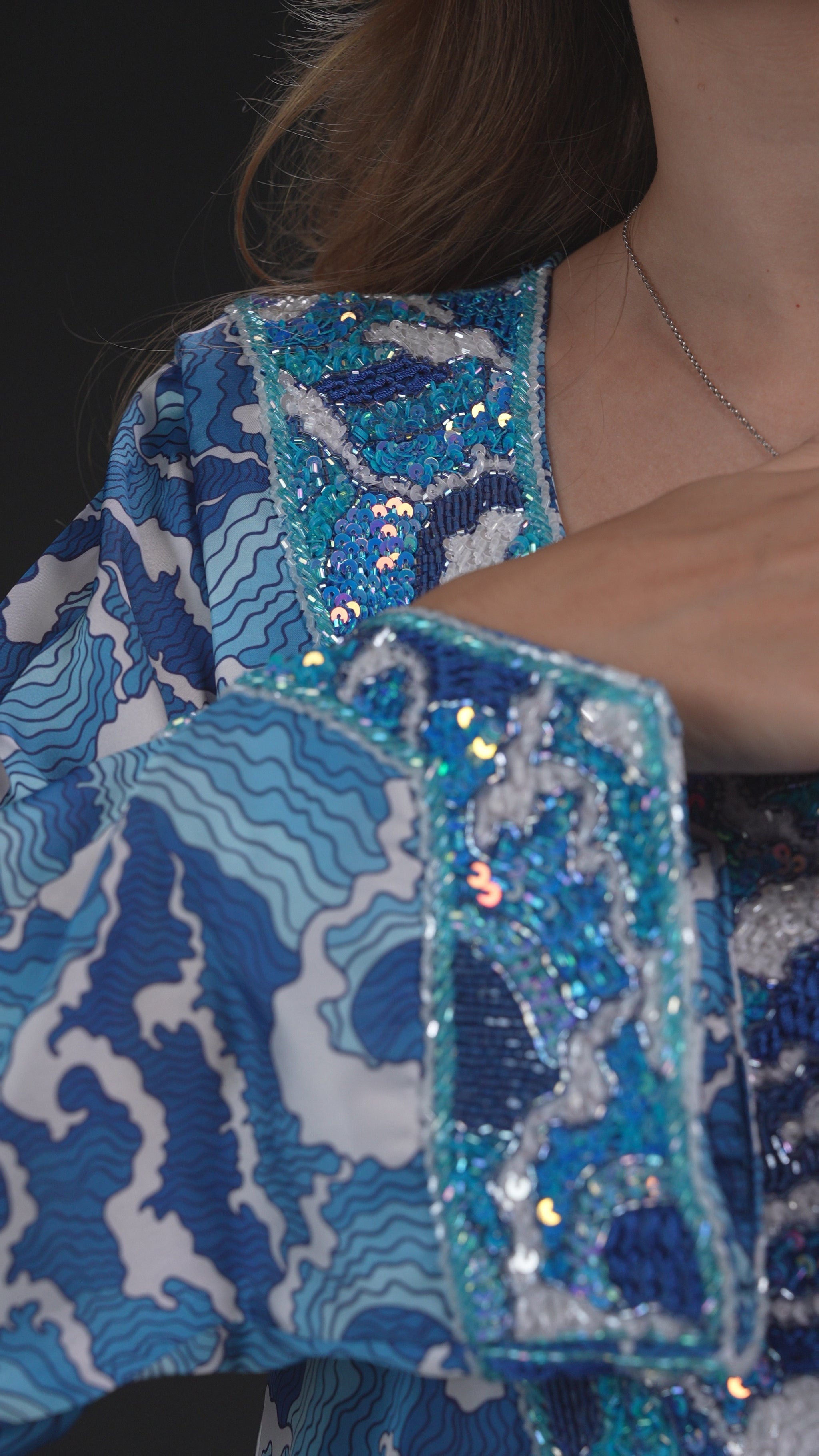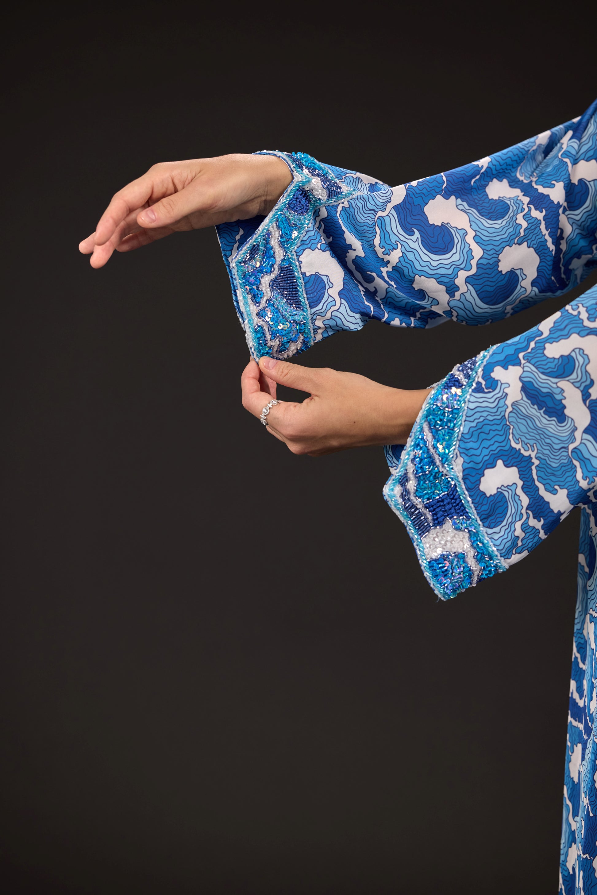 A custom-designed embroidered fabric piece that pays homage to traditional Emirati attire while drawing inspiration from the intricate waved and the gradient colors of blue.