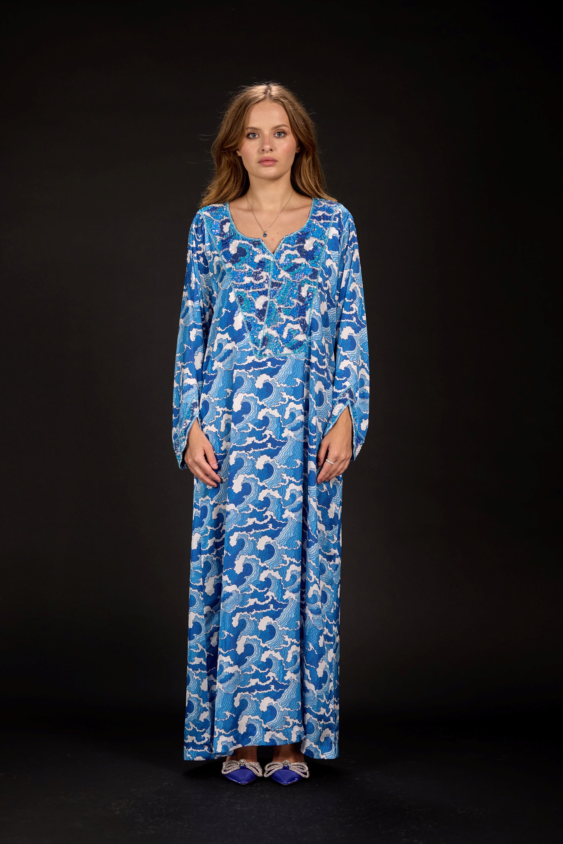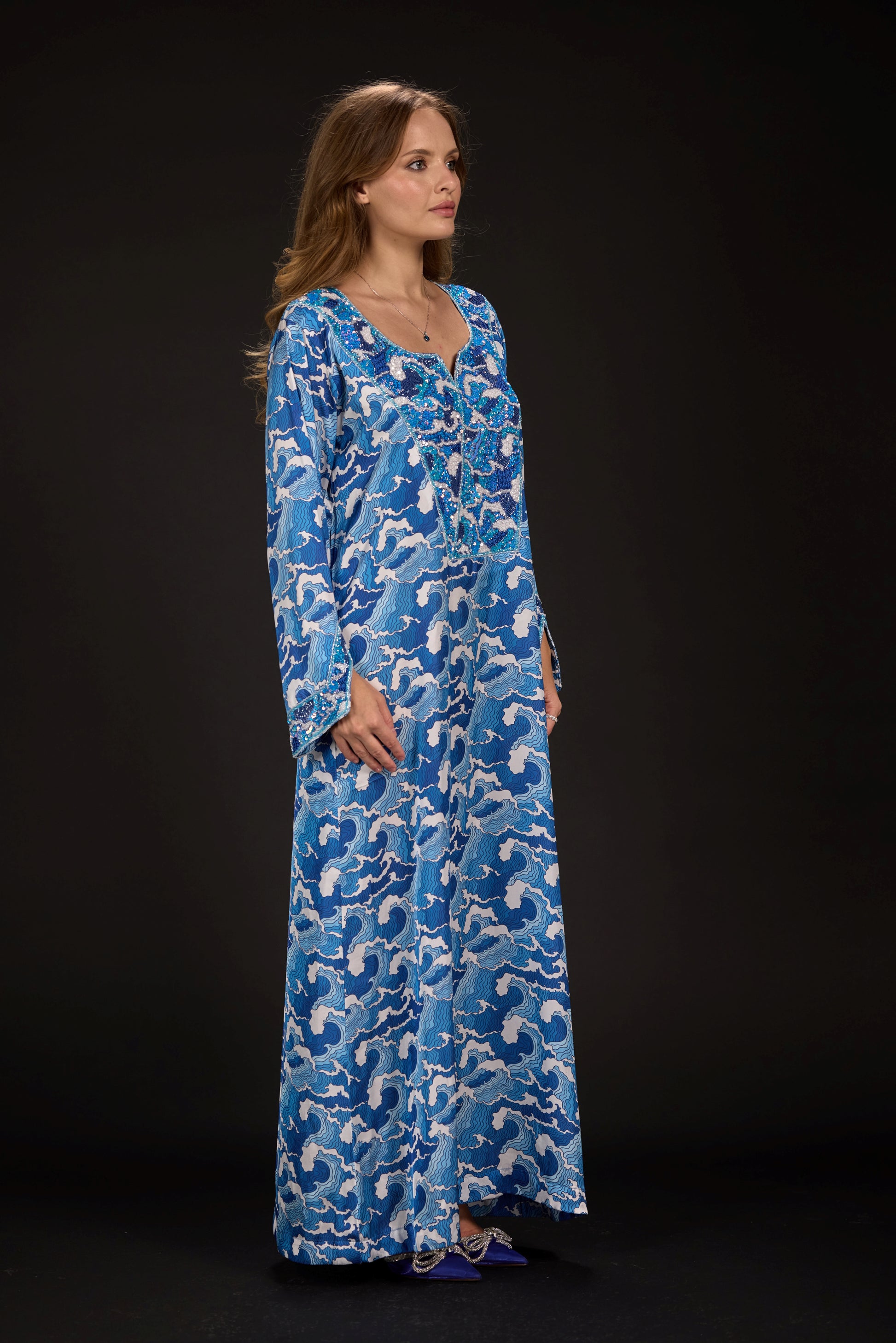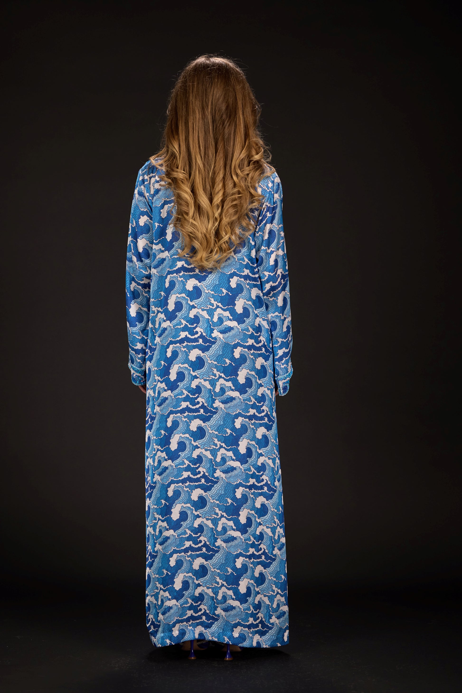 A custom-designed embroidered fabric piece that pays homage to traditional Emirati attire while drawing inspiration from the intricate waved and the gradient colors of blue.